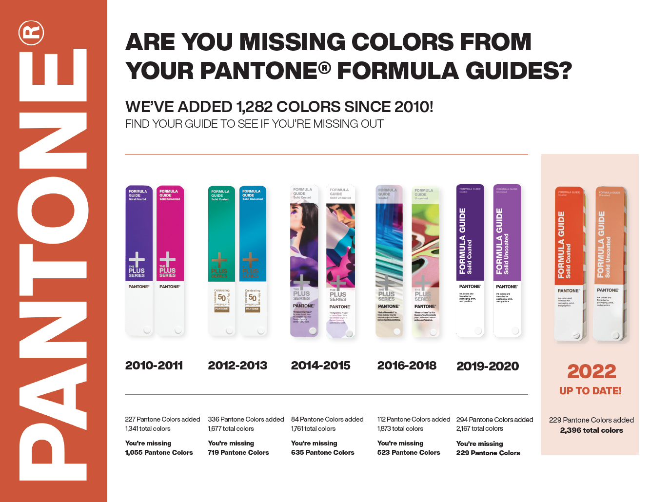 Grafiska systemet från Pantone, även kallat Pantone Matching System (PMS) består av en blank (coated) och en matt (uncoated) guide, varje ”solfjäder” innehåller 2.390 solida tryckfärger! Industristandard för val, specifikation och färgrecept av Pantone PMS Systemfärger. Färgerna ligger nu i färgordning (ej nr.-ordning). Ett index ingår för att lättare kunna hitta färgen. Exempel på färg-nr: "123 C" eller "123 U". (Sid-nr 5 C resp 5 U). Här finner du också färgbenämningar som "Warm Gray 1" samt en sida med guld/brons/silver-färgerna; 871, 872, 873, 874, 875, 876 och 877. Med Solid Formula guiderna ingår nu också en flik, ColorChecker Lighting Indicator D50, för att kunna kontrollera om ljusförhållanderna är de optimala. Ett mycket bra verktyg!