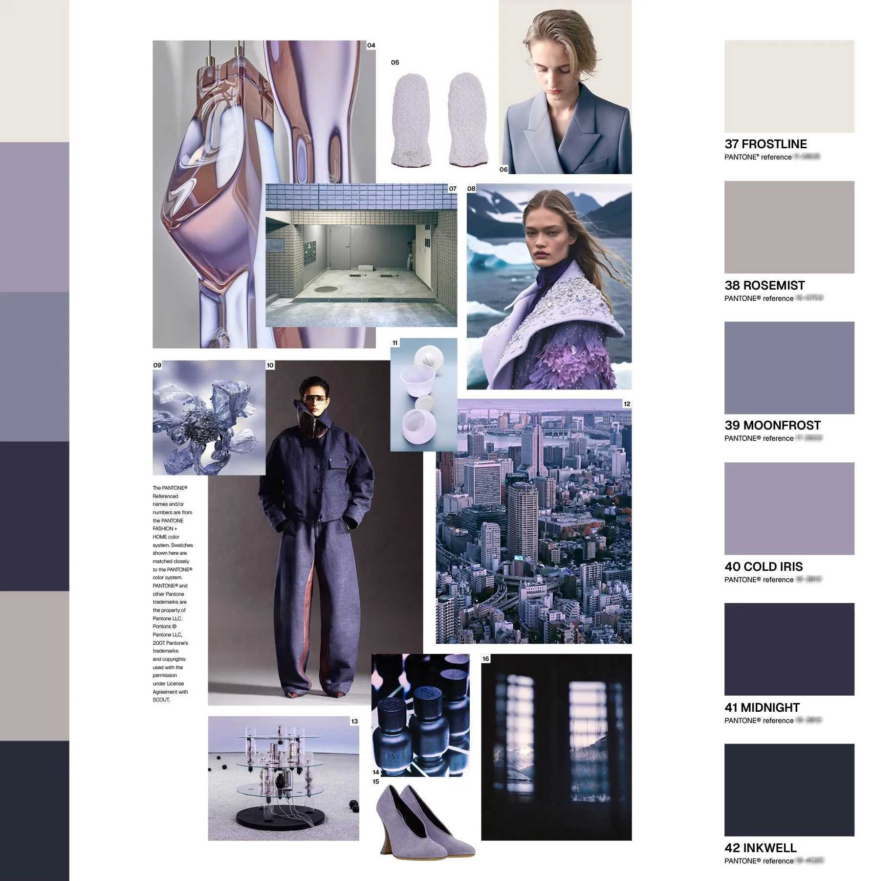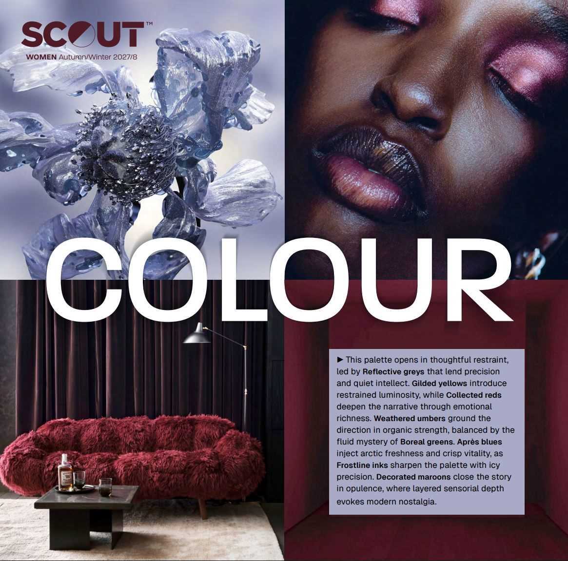 Part III. Printed + swatched COLOUR + CONCEPT report is a printed trend book, incl colour palettes and moodboards with Scout's uniquely dyed colour swatches (cotton). All swatches in the printed book have reference to the closest match in Pantone TCX & PMS systems. Includes: