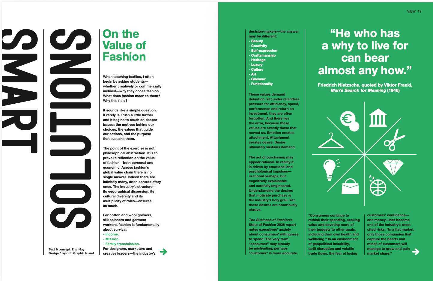 " - We will be looking at ways to action and deliver ideas in a genderless, seasonless and peer group manner. Above all we will be researching and connecting systems by which to deliver our fashion concepts in a responsible and ecological way". Targeting FASHION: Womenswear, Menswear, Casual & Athleisurewear. VIEW magazines develop according to new market needs. VIEW magazine is a merged hybrid of Textile View Magazine and View2 magazine = VIEW including 4 issues per year. Publisher David R Shah and the team tell us "- we decided to create a modern colour-material-trend-magazine where fashion forecasting takes a broader grip."