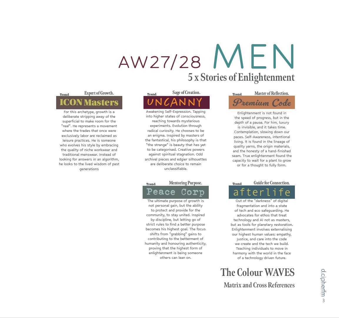 Autumn/Winter 2027-28, menswear forecast by d.cipherfm, focuses on the exact colours of the season. Being the colourist experts, the trends and storytelling evolve from there. No other menswear book in the market has so many colour combos presented in each trend story, all in real cotton d.cipherfm original swatches.